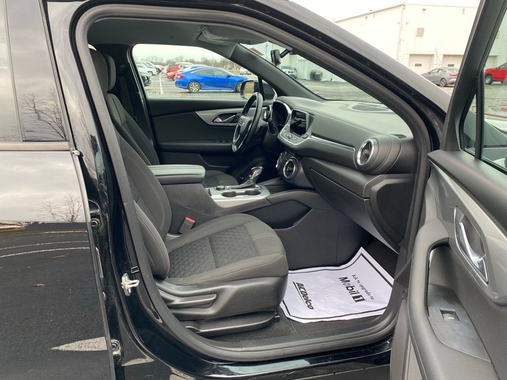 Black 2019 Chevrolet Blazer 1LT FWD 9-Speed Automatic 2.5L 4-Cylinder 4D Sport Utility, 2.5L 4-Cylinder, 9-Speed Automatic, FWD, Black, Jet Black Cloth, 3.80 Final Drive Ratio, 4-Wheel Disc Brakes, 6 Speakers, 6-Speaker Audio System Feature, ABS brakes, Air Conditioning, Alloy wheels, AM/FM radio: SiriusXM, Apple CarPlay/Android Auto, Automatic temperature control, Black Roof Rails, Brake assist, Bumpers: body-color, Cargo Package (LPO), Child-Seat-Sensing Airbag, Compass, Convenience & Driver Confidence Package, Delay-off headlights, Driver door bin, Driver vanity mirror, Dual front impact airbags, Dual front side impact airbags, Electronic Stability Control, Emergency communication system: OnStar and Chevrolet connected services capable, Four wheel independent suspension, Front & Rear Custom Molded Splash Guards, Front anti-roll bar, Front Bucket Seats, Front Center Armrest, Front dual zone A/C, Front reading lights, Fully automatic headlights, Heated door mirrors, Heated Driver & Front Passenger Seats, High-Intensity Discharge Headlights, Illuminated entry, Inside Rear-View Auto-Dimming Mirror, Knee airbag, Lane Change Alert w/Side Blind Zone Alert, Leather Shift Knob, Low tire pressure warning, Occupant sensing airbag, Outside Heated Power-Adjustable Body-Color Mirrors, Outside temperature display, Overhead airbag, Overhead console, Panic alarm, Passenger door bin, Passenger vanity mirror, Power door mirrors, Power driver seat, Power steering, Power windows, Preferred Equipment Group 1LT, Premium Cloth Seat Trim, Radio data system, Radio: Chevrolet Infotainment 3 System, Rear anti-roll bar, Rear Cross Traffic Alert, Rear Park Assist w/Audible Warning, Rear Power Programmable Liftgate, Rear reading lights, Rear seat center armrest, Rear window defroster, Rear window wiper, Remote keyless entry, Remote Vehicle Starter System, Retractable Cargo Shade, Ride & Handling Suspension, Security system, Set of 4 Wheel Locks (LPO), Speed control, Speed-sensing steering, Split folding rear seat, Spoiler, Steering wheel mounted audio controls, Tachometer, Telescoping steering wheel, Tilt steering wheel, Traction control, Trip computer, Universal Home Remote, Variably intermittent wipers, Vertical Cargo Net (LPO), Voltmeter, Wheels: 18 Bright Silver Aluminum.